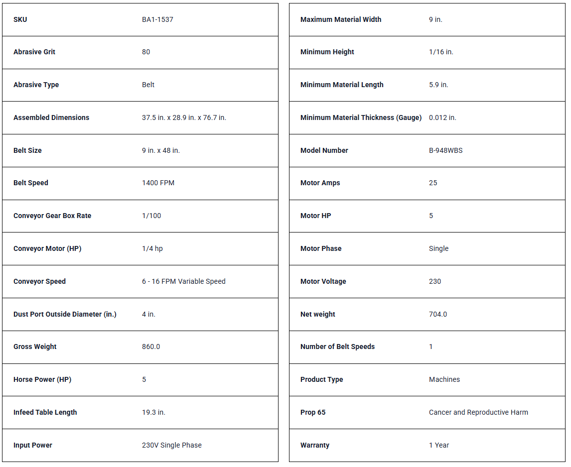Industrial Finishing: The Baileigh B-948WBS is a 9″ x 48″ small piece wide belt sander engineered for high-precision finishing, sanding, deburring, and edge preparation of metal components in industrial environments.