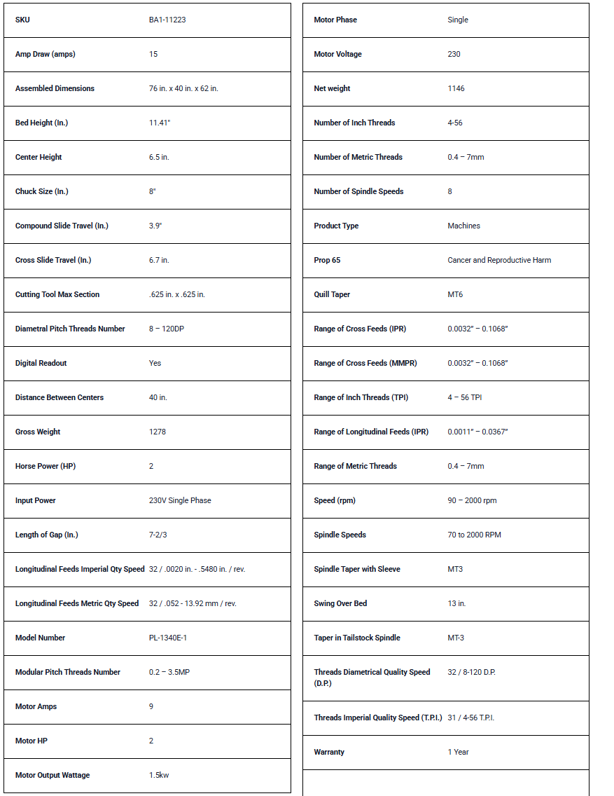 Whether you're upgrading an older belt-driven lathe or expanding your shop’s manual machining capacity, the PL-1340E-1 provides controlled power, increased bar capacity, and shop-ready safety features without unnecessary complexity.