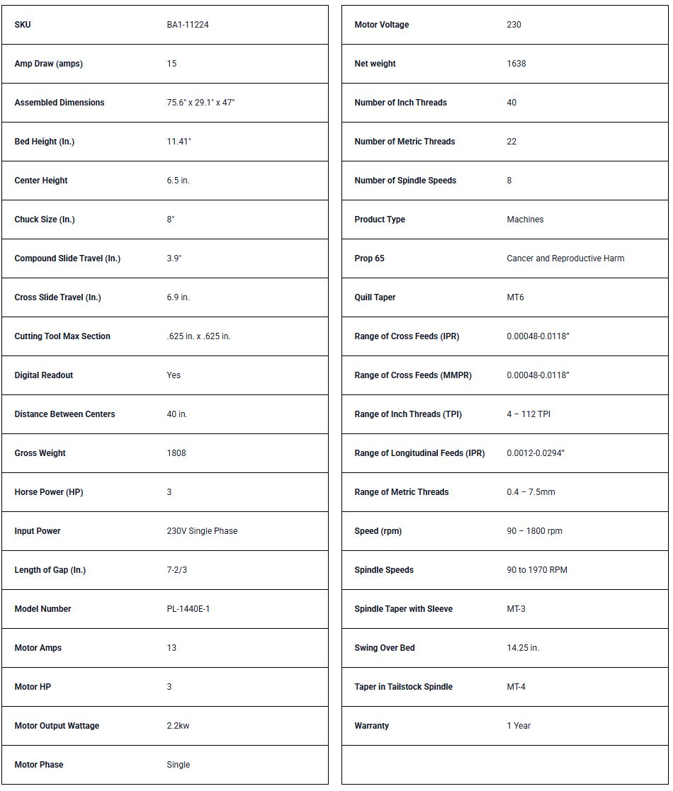 The Baileigh PL-1440E-1 is a heavy-duty 14” x 40” gear head engine lathe built for shops that need more horsepower, greater swing capacity, and consistent turning performance in a single-phase configuration.